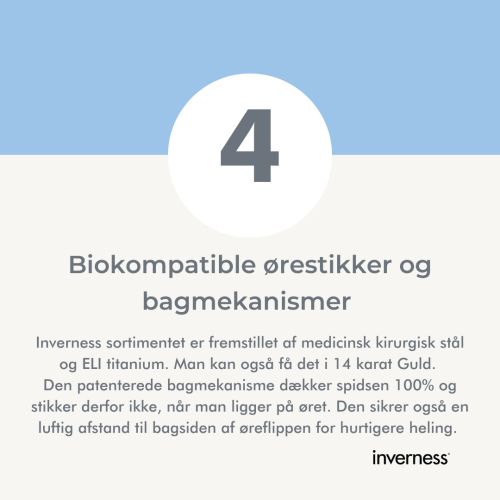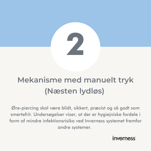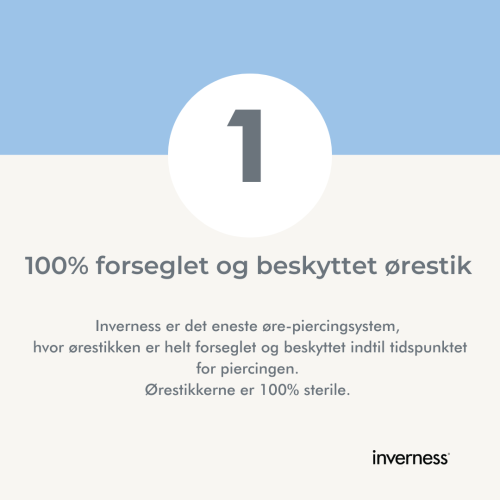 Hos Guldsmed Borup anvender vi Inverness ørepiercingsystem – en af de mest skånsomme og sterile metoder til at lave huller i ørene. Pistolen laver kun en lav lyd, og ørestikkerne leveres i en forseglet emballage, der først åbnes lige inden brug. Dette sikrer 100% sterilisering og mindsker risikoen for infektion betydeligt.