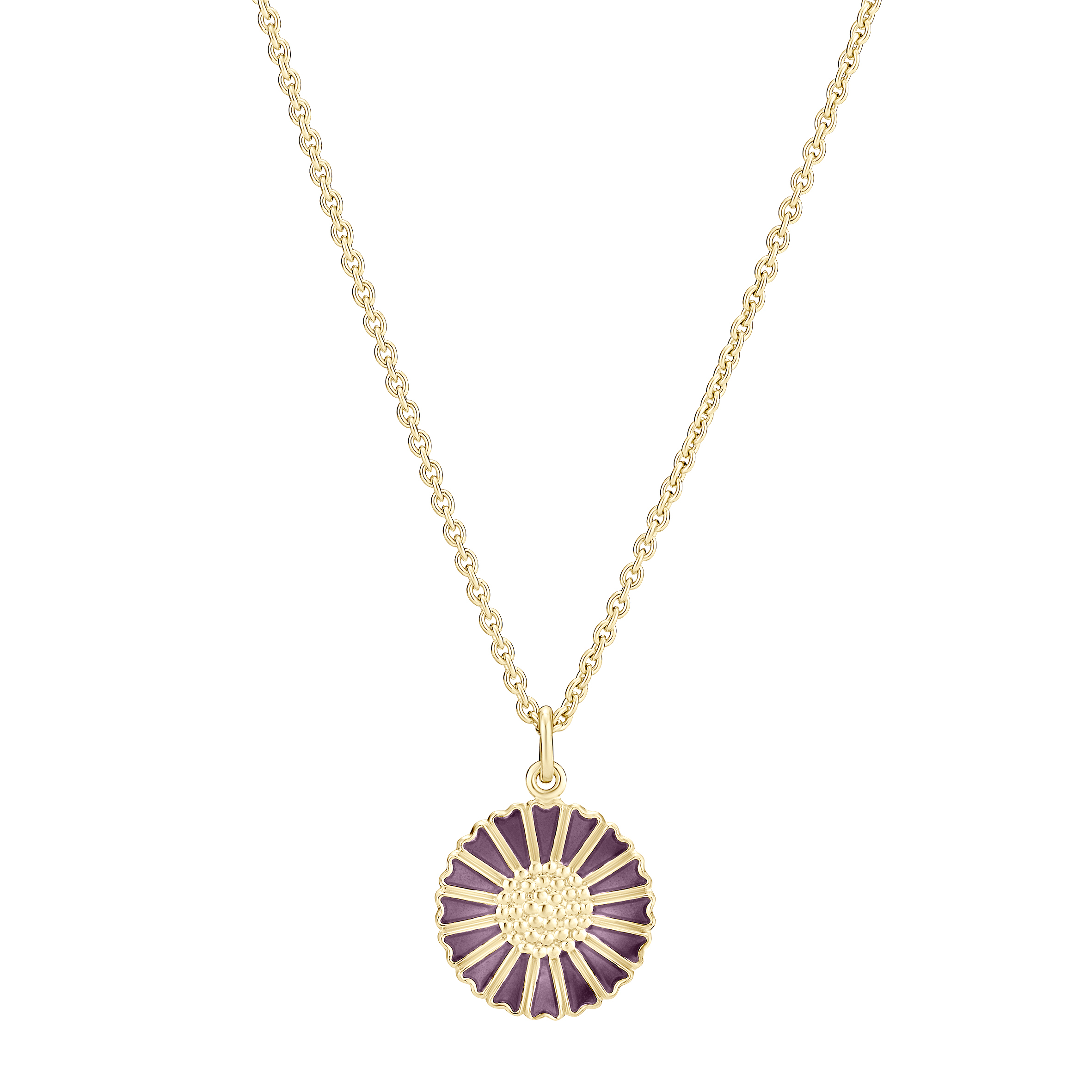 Denne smukke Lund Copenhagen halskæde forener klassisk dansk design med et frisk og farverigt udtryk. Det fine margueritvedhæng i lilla emalje stråler som en lille blomst i solskin og giver smykket et feminint og livligt look. 💜