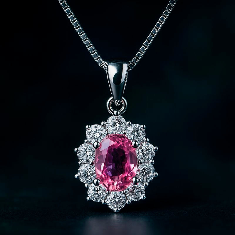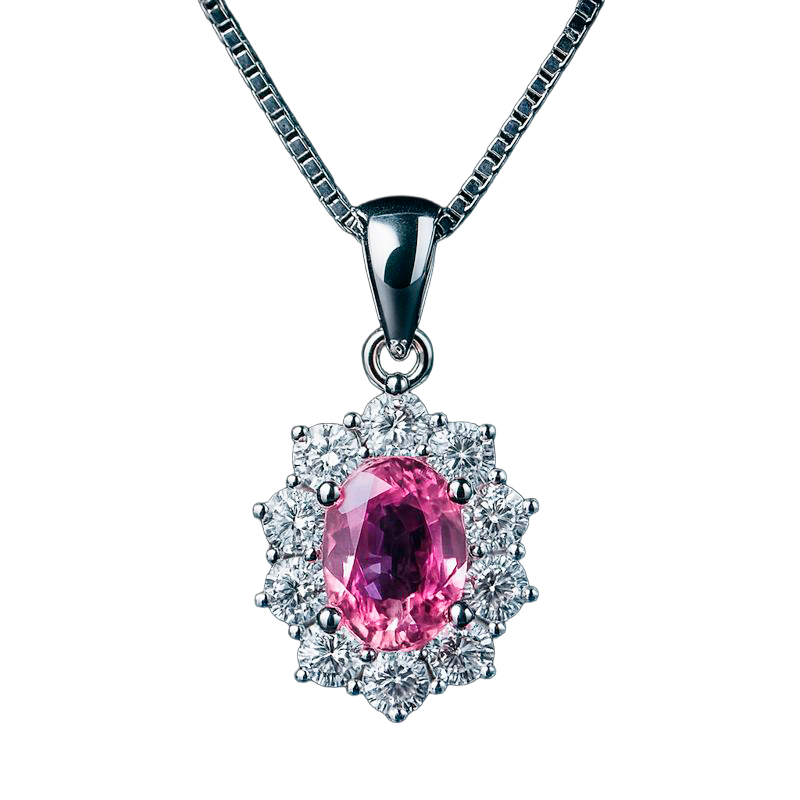14kt hvidgulds vedhæng med 1,45ct pink safir og 0,88ct diamanter monteret på rhodineret sølvkæde på 45 cm.