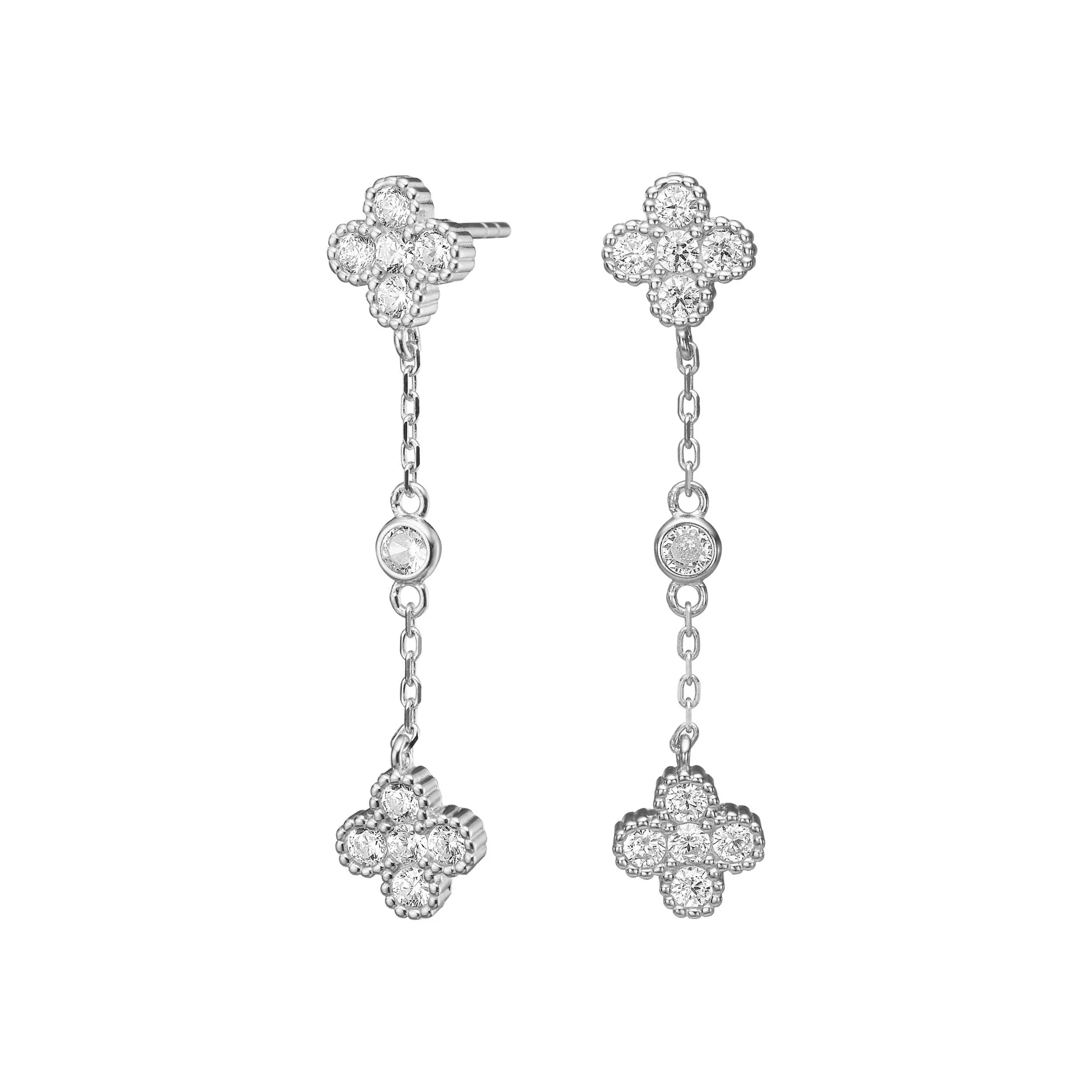 Disse elegante sølvfarvede øreringe er designet med et feminint og raffineret udtryk, der skaber et eksklusivt blikfang. Øreringene er sammensat af fine kløvermotiver dekoreret med funklende klare sten, som elegant forbindes af en let kæde med en enkelt indfattet sten i midten. Det giver smykket et smukt, harmonisk og bevægeligt design.