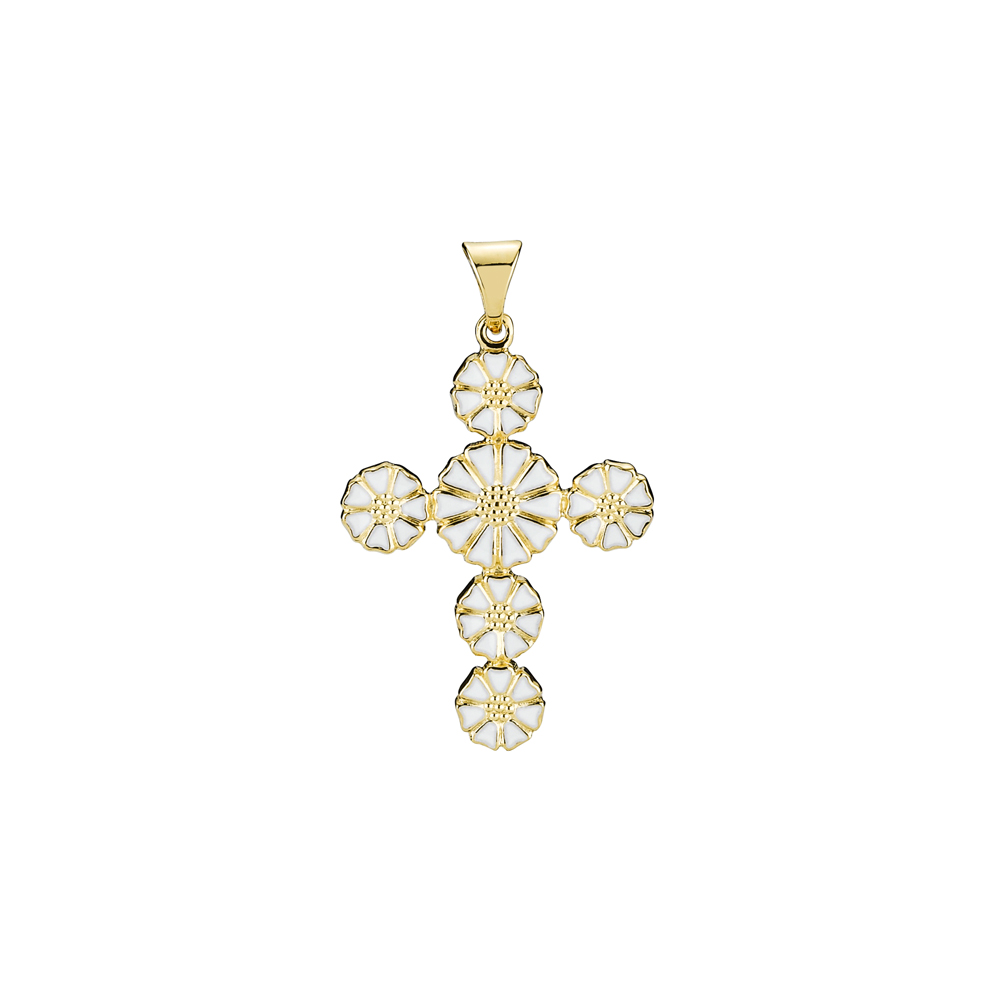 Kors fra Lund Copenhagen i forgyldt sølv med margueritter med hvid emalje. Margueritterne måler 7,5mm og 5mm. Korset måler 24x19 mm.