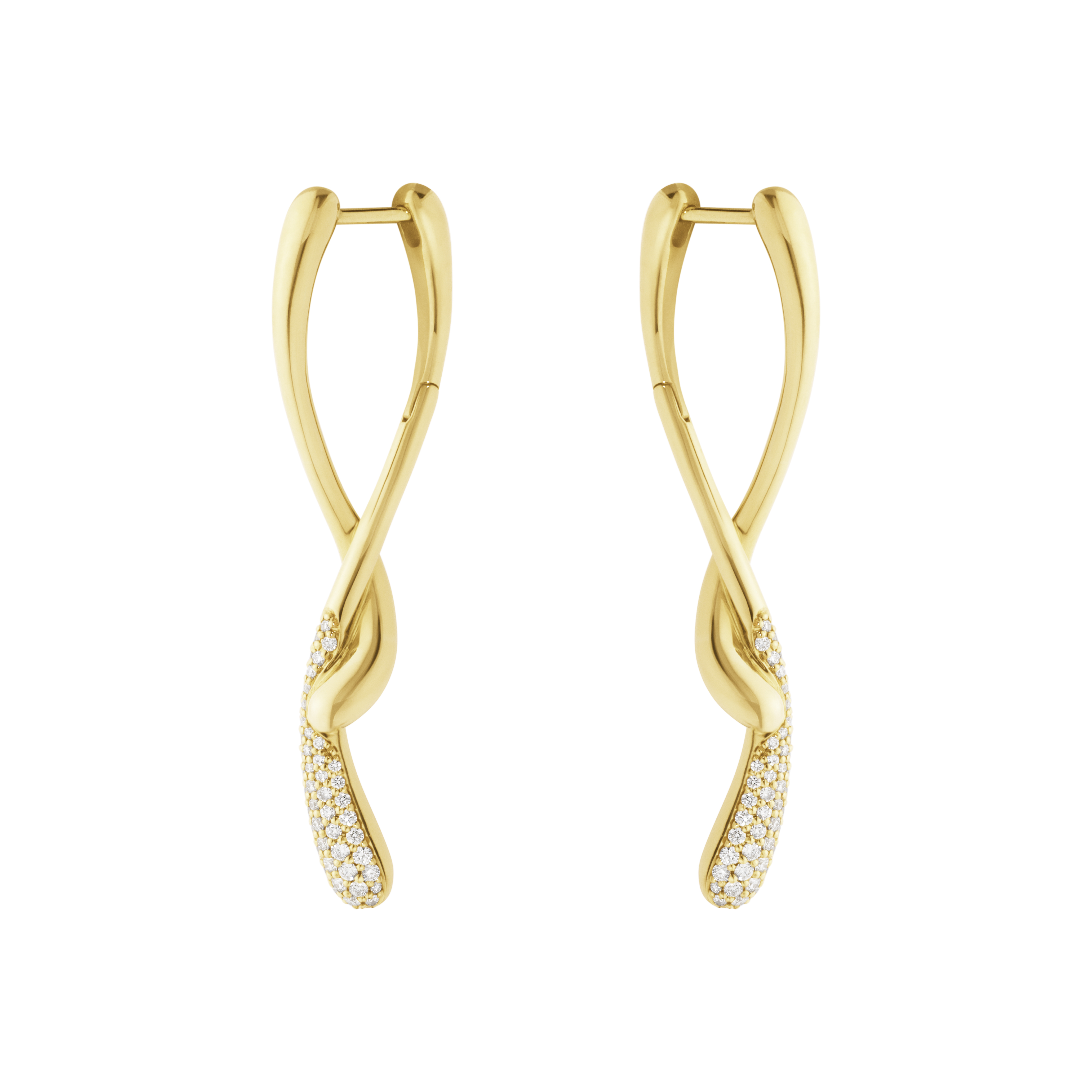 De brillantslebne diamanter tilfører et diskret, funklende spil af lys, som smukt fremhæver øreringenes organiske linjer. Kontrasten mellem det bløde guld og de fine sten giver et eksklusivt og feminint udtryk.