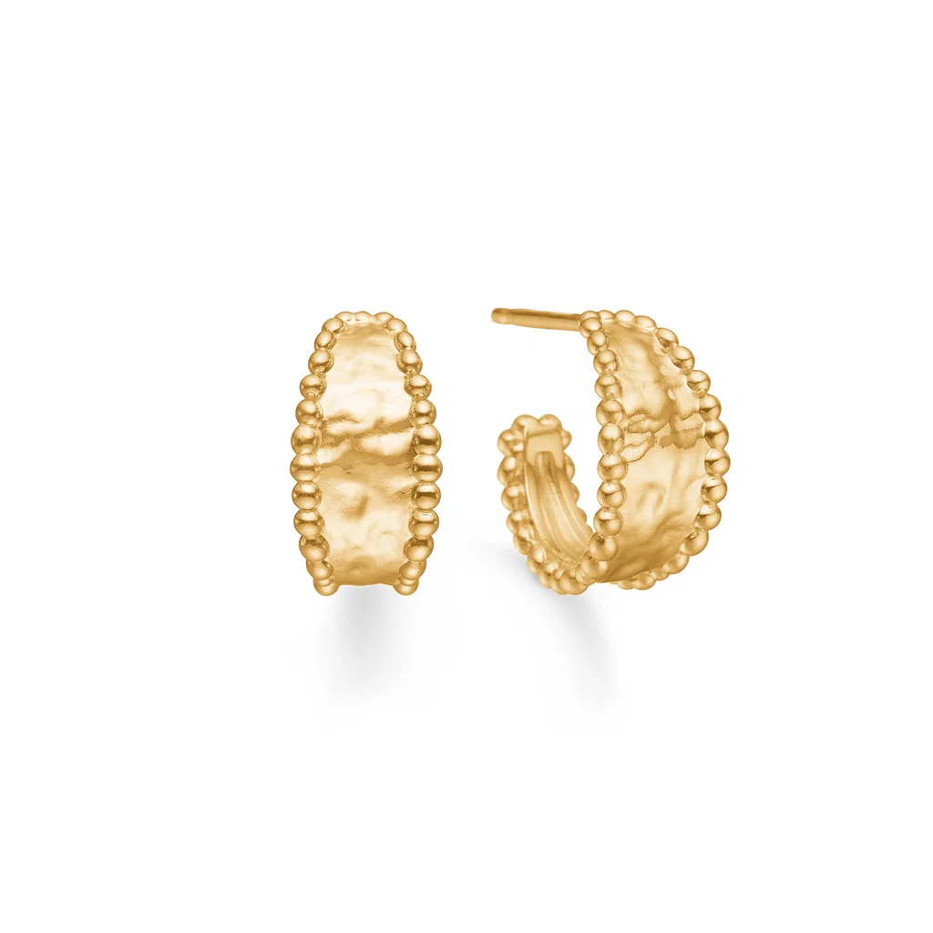 Liora øreringe i ægte 925 sterlingsølv med 18 karat forgyldning har et elegant og moderne udtryk med deres bløde, halvåbne hoop-form. Den strukturerede overflade og de fine kugledetaljer giver et varmt, feminint og raffineret look.