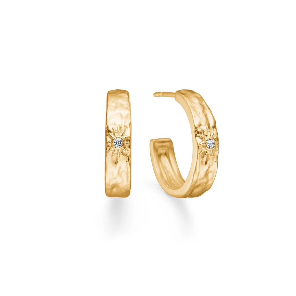 Marena halv creoler i ægte 925 sterlingsølv med 18 karat forgyldning og klar zirkonia kombinerer rå struktur med et feminint glimt. Et elegant design med varme toner og moderne karakter.
