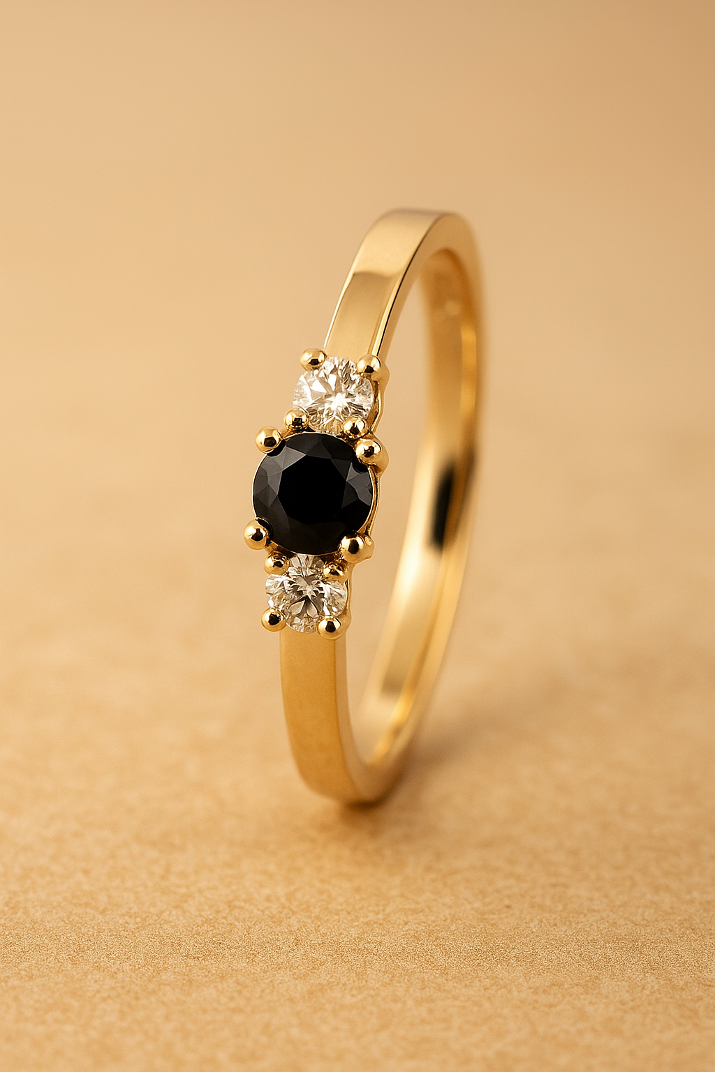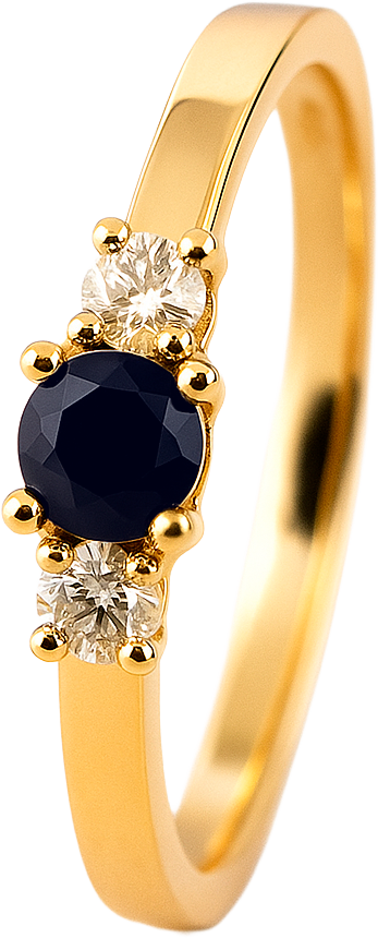 Denne smukke 14 kt. guldring forener dyb elegance med klassisk luksus. I centrum stråler en mørk, safirblå ædelsten – en farve så dyb og rolig, at den næsten føles som et lille univers. På hver side glimter to naturlige diamanter (0,11 ct. W/SI), som tilfører en vidunderlig kontrast og løfter safirens intense farvespil.