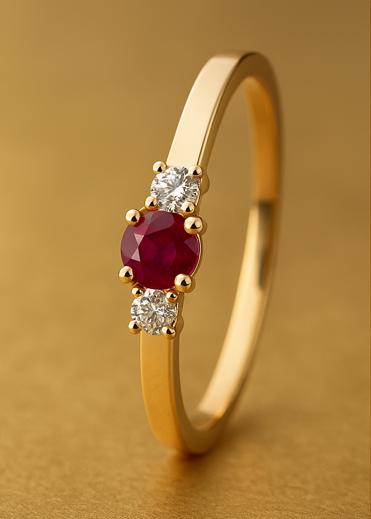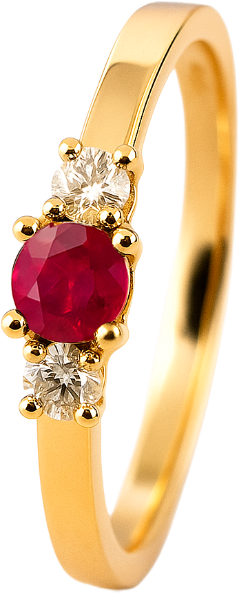 Lad hjertet falde for denne strålende 14 kt. guldring, hvor en dyb rød rubin står som smykkets passionerede midtpunkt. Rubinens intense glød fremhæves af to funklende naturlige diamanter i W/SI-kvalitet, der tilsammen giver ringen et klassisk, luksuriøst og romantisk udtryk.