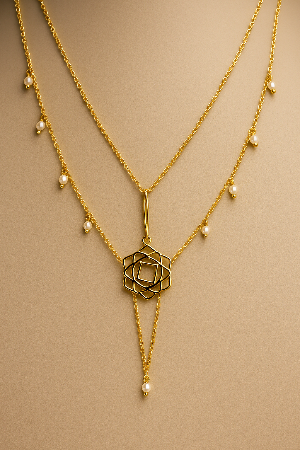 Dette forgyldte collier fra Arhms er en delikat forening af moderne design og klassisk femininitet. Den dobbelte kæde leger elegant om halsen, hvor den øverste kæde er pyntet med små, glinsende perler, mens den nederste bærer et kunstfærdigt vedhæng formet som en geometrisk blomst – et symbol på balance, styrke og skønhed.
