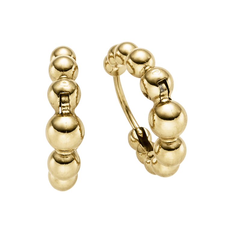 Runde øreringe i forgyldt stål med en markant række af glatte kugler hele vejen rundt. Kuglerne varierer let i størrelse og skaber et tydeligt og struktureret udtryk. Øreringene har en klassisk lås og sidder tæt til øret. Den blanke overflade og det karakteristiske design giver dem et moderne look. Som alle Arhms smykker er de vandfaste og modstandsdygtige overfor både sved og sæbe.