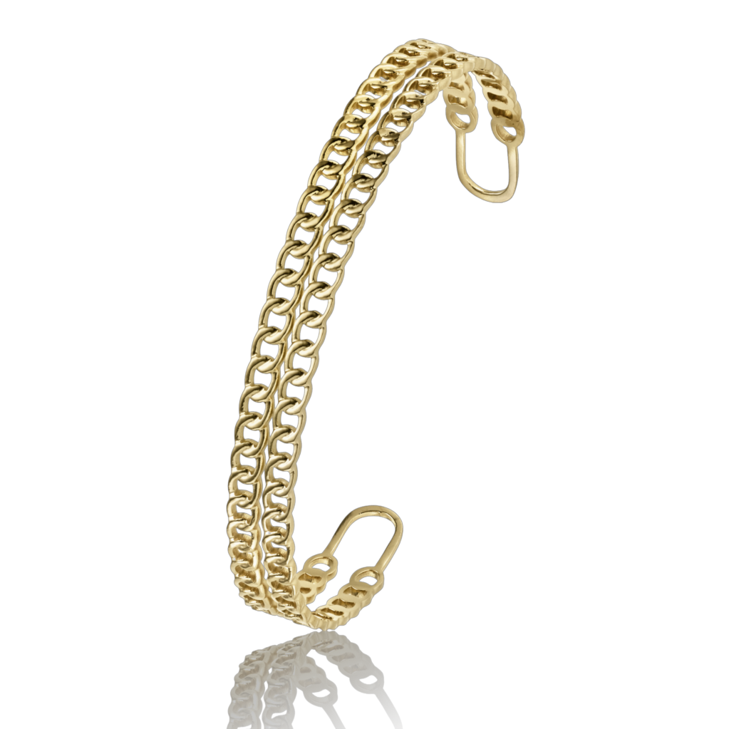 Åben armbøjle i forgyldt stål med dobbelt kædelook og afrundede ender. Designet består af to parallelle rækker med tæt sammenkædede led, som giver armbåndet et markant og struktureret udtryk. Enderne er formet som åbne led for en helhedsfornemmelse i designet. Fremstillet i vandfast stål, som tåler sved, sæbe og vand uden at miste glans.