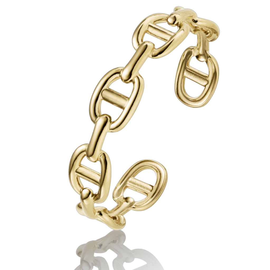 Åben armbøjle i forgyldt stål med markante, formstøbte led. Hvert led har en oval facon med tværgående stang, hvilket skaber et karakteristisk og sammenhængende udtryk. Armbåndet er stift men fleksibelt nok til nem påtagning. Overfladen er blank og glat. Fremstillet i vandfast stål, der er modstandsdygtigt overfor både sved, sæbe og vand.
