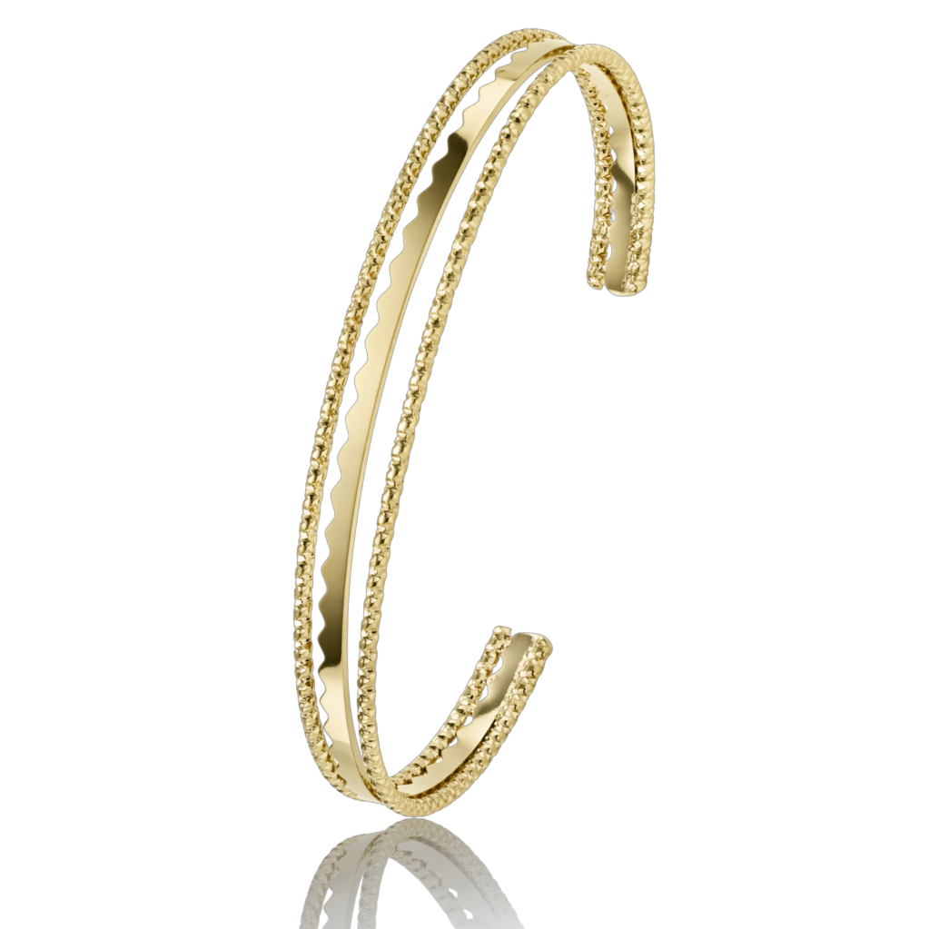 Forgyldt armbøjle med dobbeltramme og åben form. Ydersiderne er prydet med en fin, knoppet struktur, mens midterbåndet har en glat overflade med bølget kant. Designet skaber en tydelig visuel opdeling og et elegant spil mellem tekstur og glathed. Armbåndet er fremstillet i vandfast stål, der er modstandsdygtigt overfor sved, sæbe og vand.