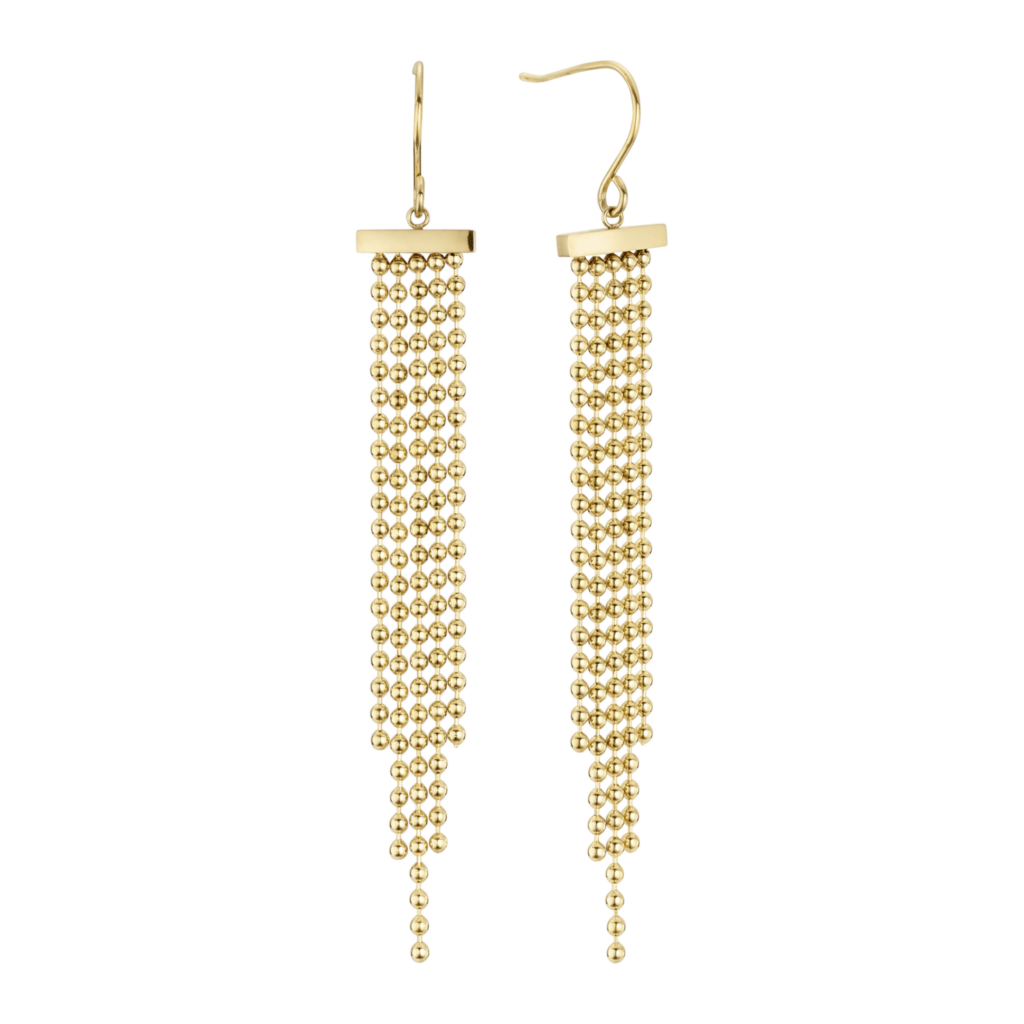 Lange ørehængere i forgyldt stål bestående af flere rækker små kuglekæder samlet i en glat stang foroven. Hver række afsluttes med en enkelt kugle, som giver et let og bevægeligt udtryk. Øreringene har krog, som gør dem nemme at tage af og på. Kuglekæderne hænger frit og skaber struktur og spil i designet. Smykket er vandfast og modstandsdygtigt mod daglig slitage.
