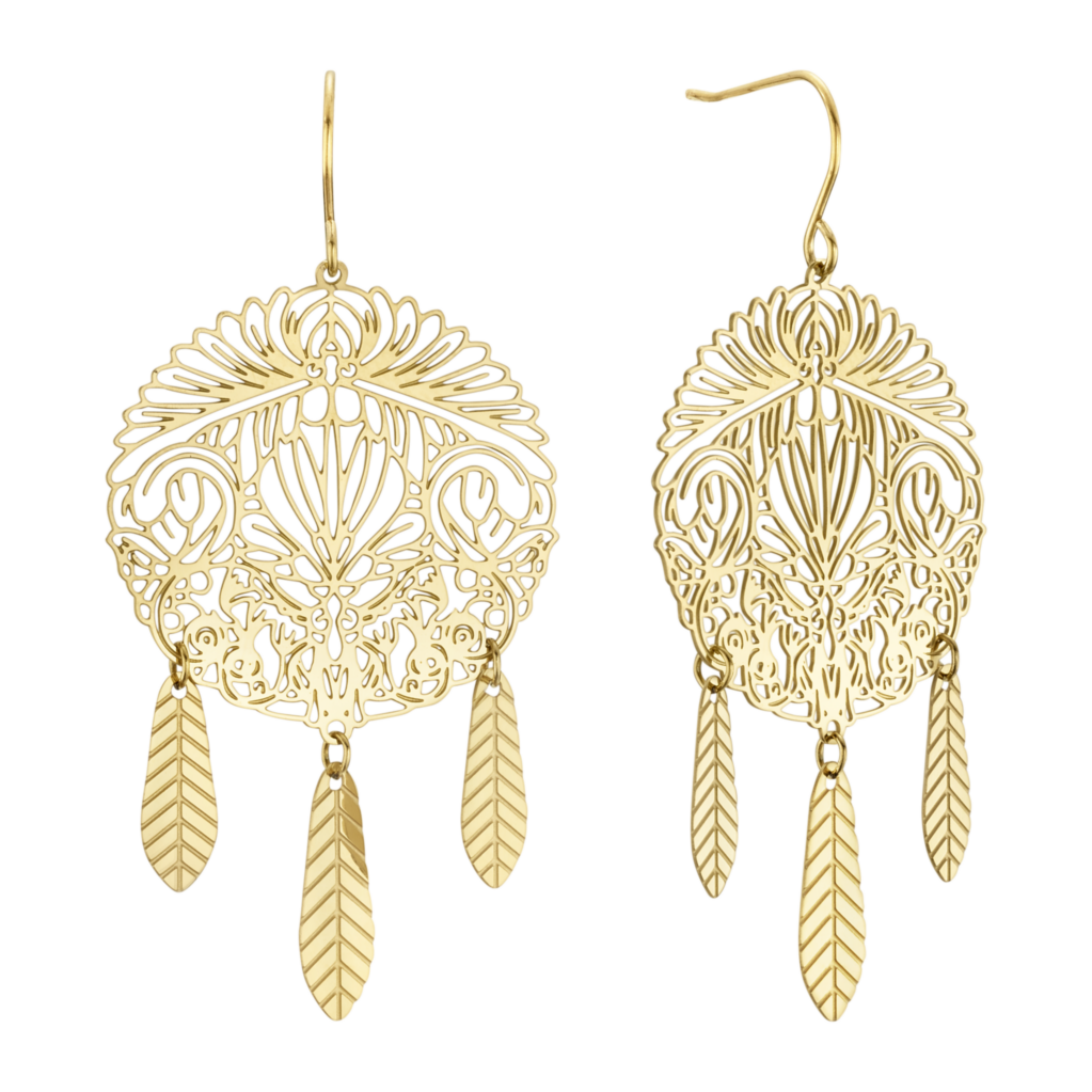 Forgyldte ørehængere i stål med udskåret mønster inspireret af en drømmefanger. Den runde plade er fint udformet med symmetriske detaljer og afsluttes med tre bevægelige fjerformede vedhæng. Øreringen har en enkel krog, som gør den let at tage på. Det lette og detaljerede design giver smykket karakter uden at virke tungt. Vandfast og modstandsdygtigt mod både sved og fugt.