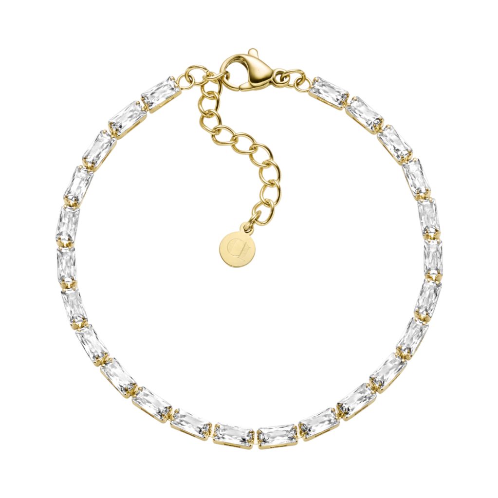 Novara-armbåndet fra Arhms forener klassisk elegance med moderne finesse. De rektangulære, klare sten fanger lyset fra alle vinkler og glitrer smukt mod den varme forgyldte base.