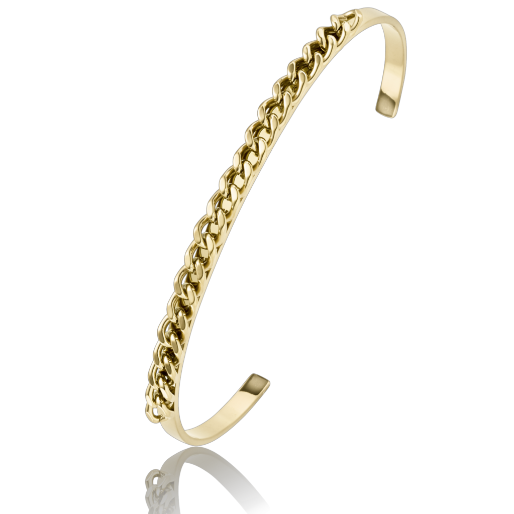 Åben armbøjle i forgyldt stål med indlagt panserkæde i midten. Kædens flade led ligger jævnt langs armbåndets yderside og skaber en markant kontrast til de glatte kanter. Bøjlen har en smal profil og let fleksibilitet, som gør den nem at tage af og på. Udført i vandfast stål, der tåler sved, vand og sæbe uden at miste glansen.