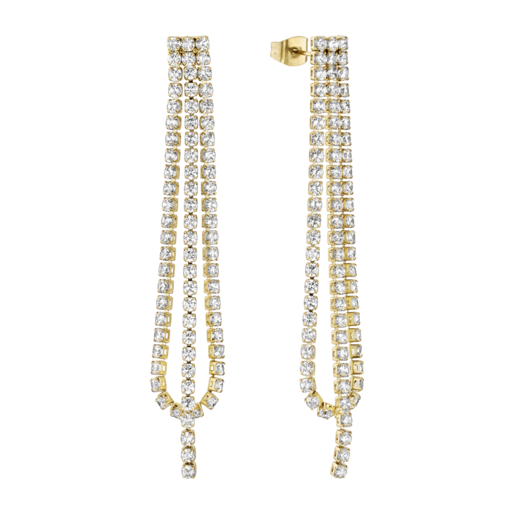 Forgyldte ørehængere i stål med tre bevægelige kæder, der hver er tæt besat med klare, facetslebne sten. De tre rækker samles let i bunden og skaber en elegant dråbeeffekt. Ørestikken er diskret og lukkes med klassisk lås. Designet giver et fleksibelt fald og masser af bevægelse. Smykket er vandfast og tåler både sved og sæbe uden at miste glans eller struktur.