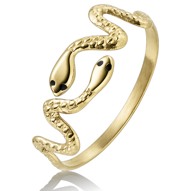 Den forgyldte overflade fremhæver ringens fine struktur, mens de diskrete sorte detaljer i slangehovederne tilfører dybde og karakter. Milano er et smykke, der skiller sig ud med sin skulpturelle form, men stadig føles let og raffineret på hånden.