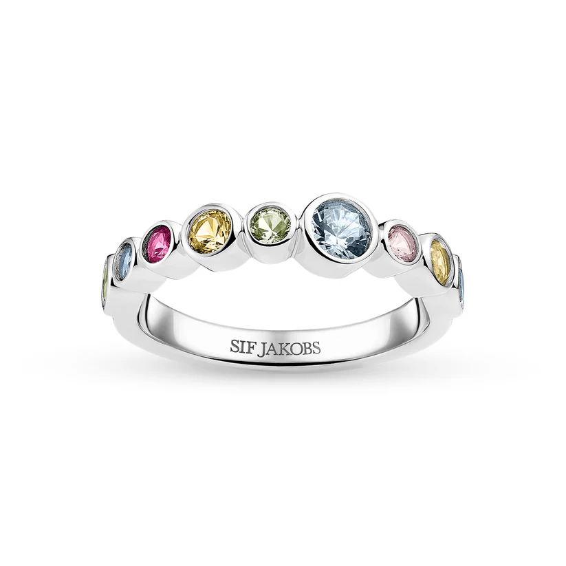 Oplev elegance med denne ring i rhodineret 925 sterlingsølv. Den polerede overflade og de håndsatte facetslebne flerfarvede zirkonia giver et strålende væsen.