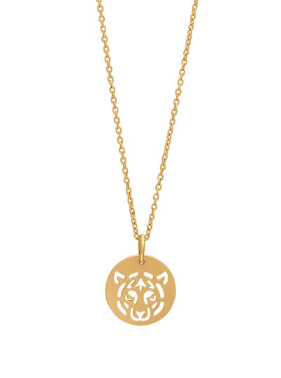 Vedhæng i forgyldt sølv med tiger monteret på forgyldt kæde. Vedhænget måler 15 mm. Kæden måler 45 + 5 cm.