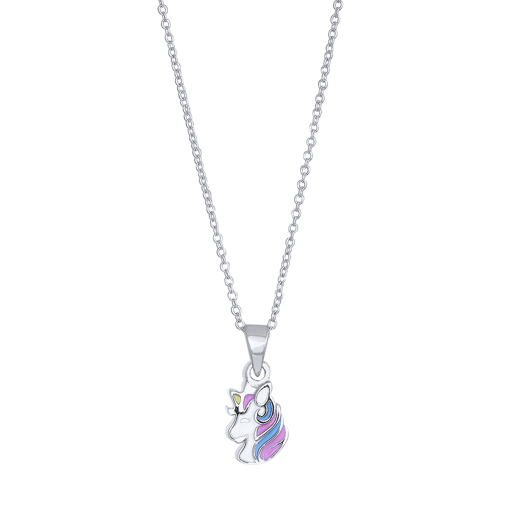 Kæde i rhodineret sølv med vedhæng med enhjøring med emalje. Kæden måler 38 cm.