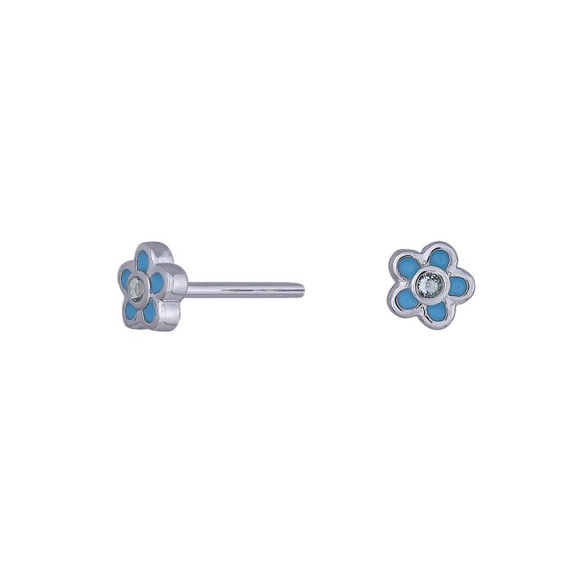 Ørestikker i rhodineret sølv med blomster med emalje og syntetisk zirkonia. Ø 5 mm.