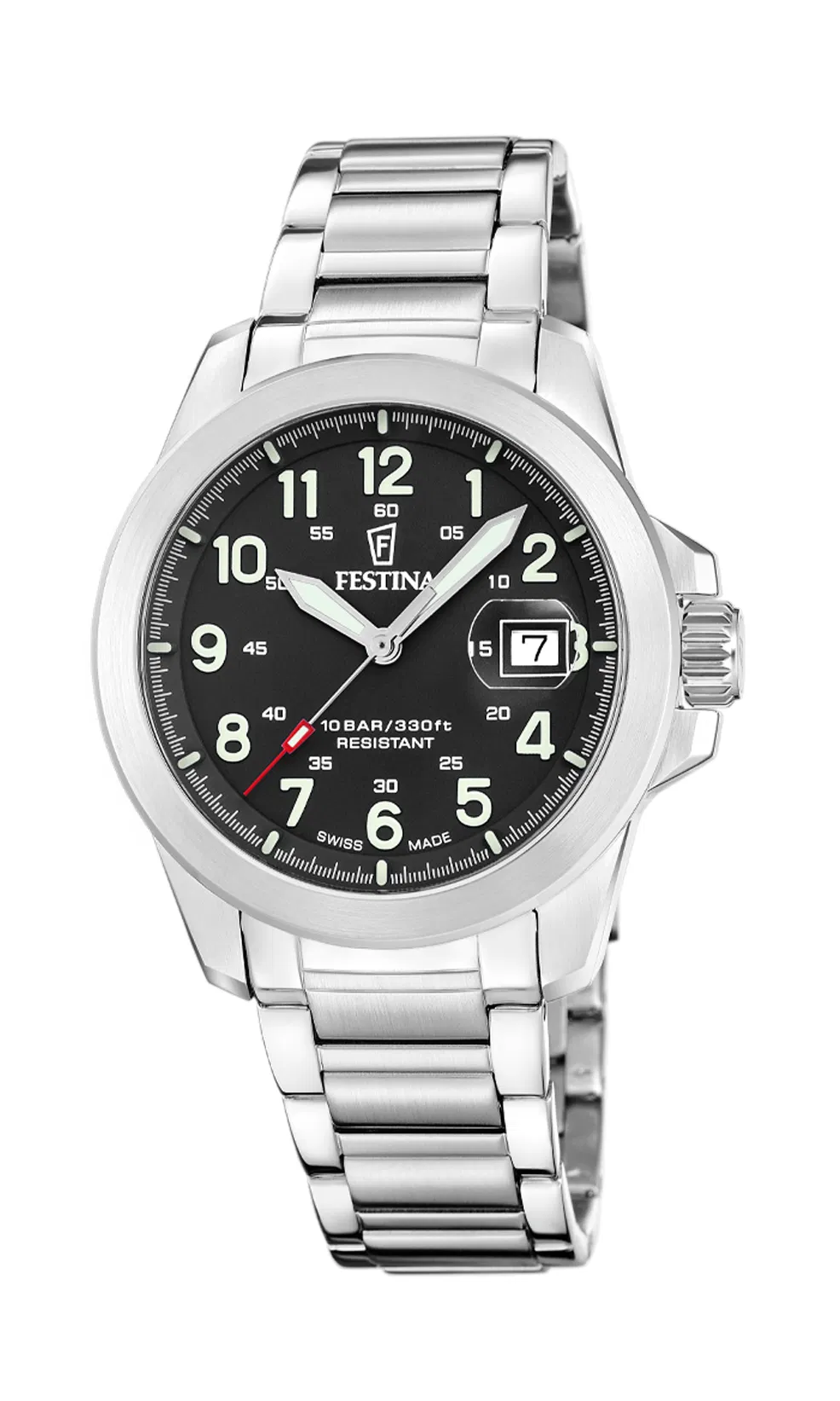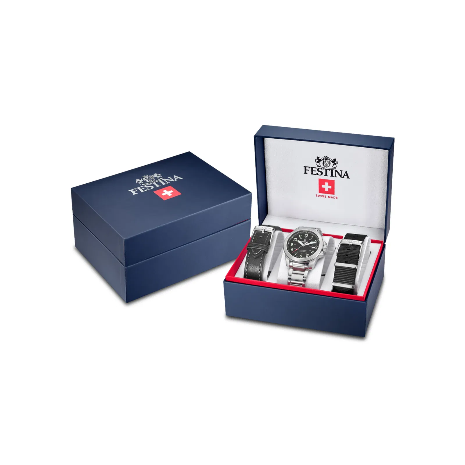 Leveres i gaveæske med en sortlæderrem og en sort natorem i nylon. Uret er monteret stållænke ved køb.